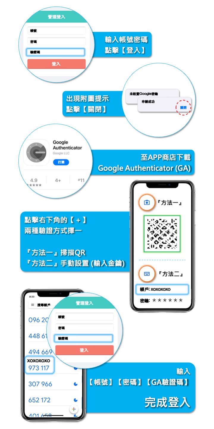 步驟三 : 確認app綁定後 關閉目前視窗 app內顯示驗證碼 輸入驗證碼欄位內